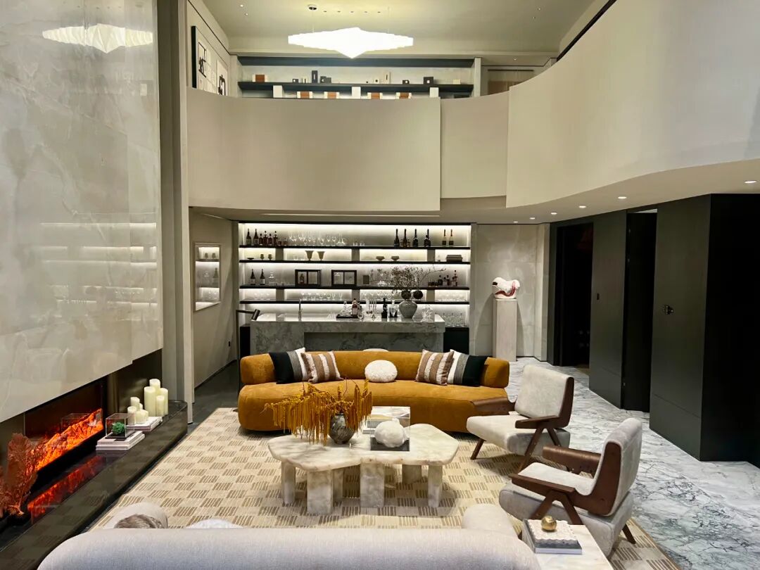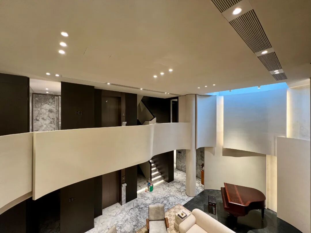 对于**叠墅产品**,设计师充分利用了艺术漆的无缝特性,在挑高区域创造出整体性的视觉效果。从墙面到顶面的连续使用,增强了空间的整体感和延伸感,使得空间感更为开阔。