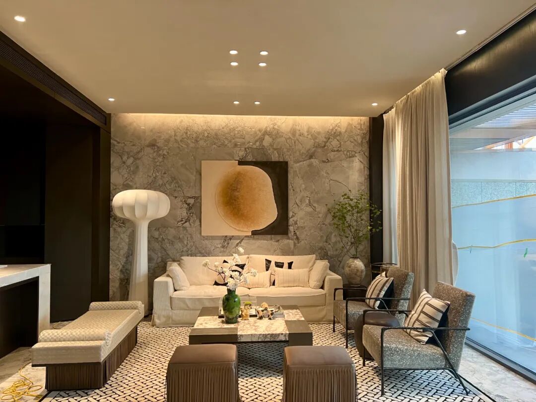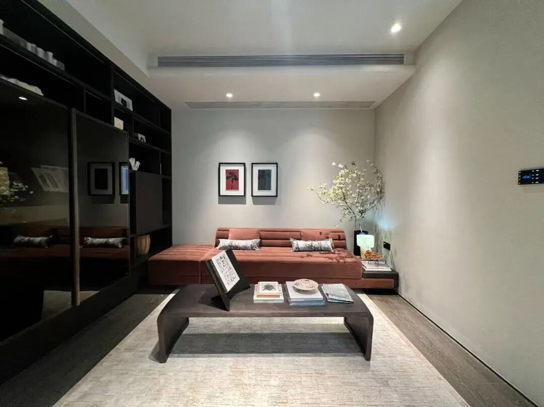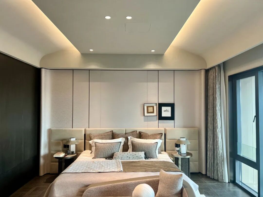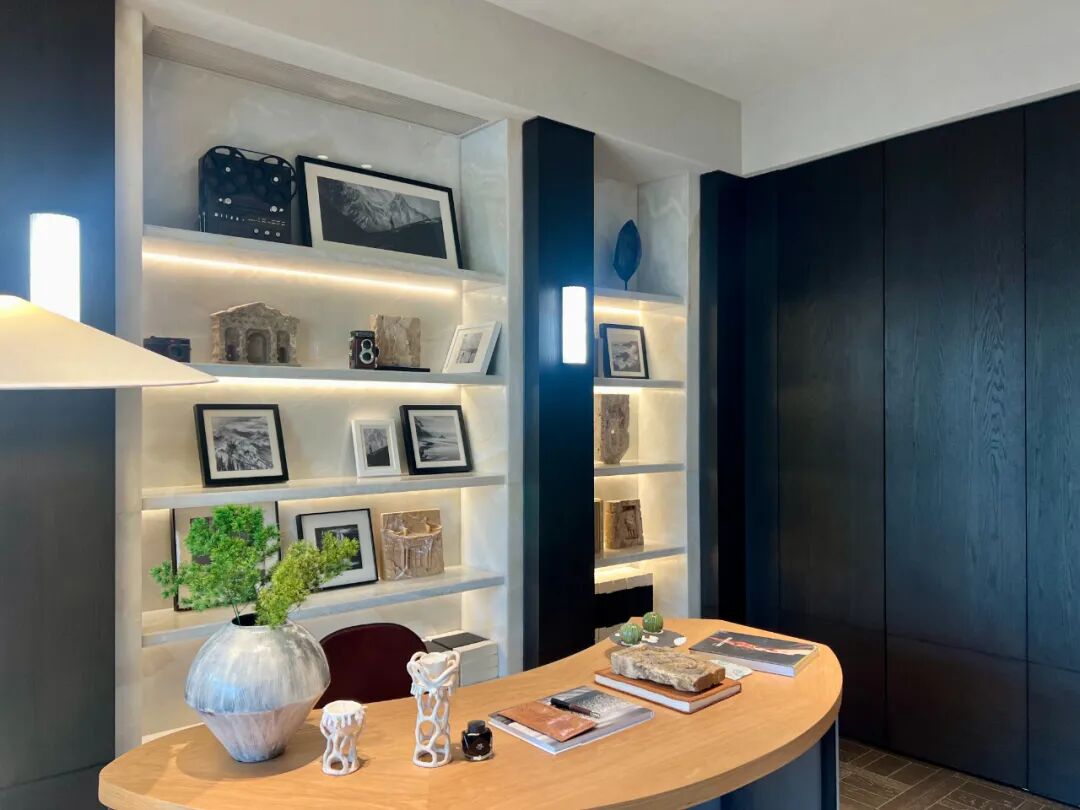 “我们选择深黑咖木饰面,是因为它的沉稳能够平衡浅米灰色的轻盈,同时木质本身的天然纹理又能与艺术漆的砂感形成呼应,”负责该样板房的设计师解释说,“这种搭配既现代又永恒,不会随着潮流逝去而显得过时。”