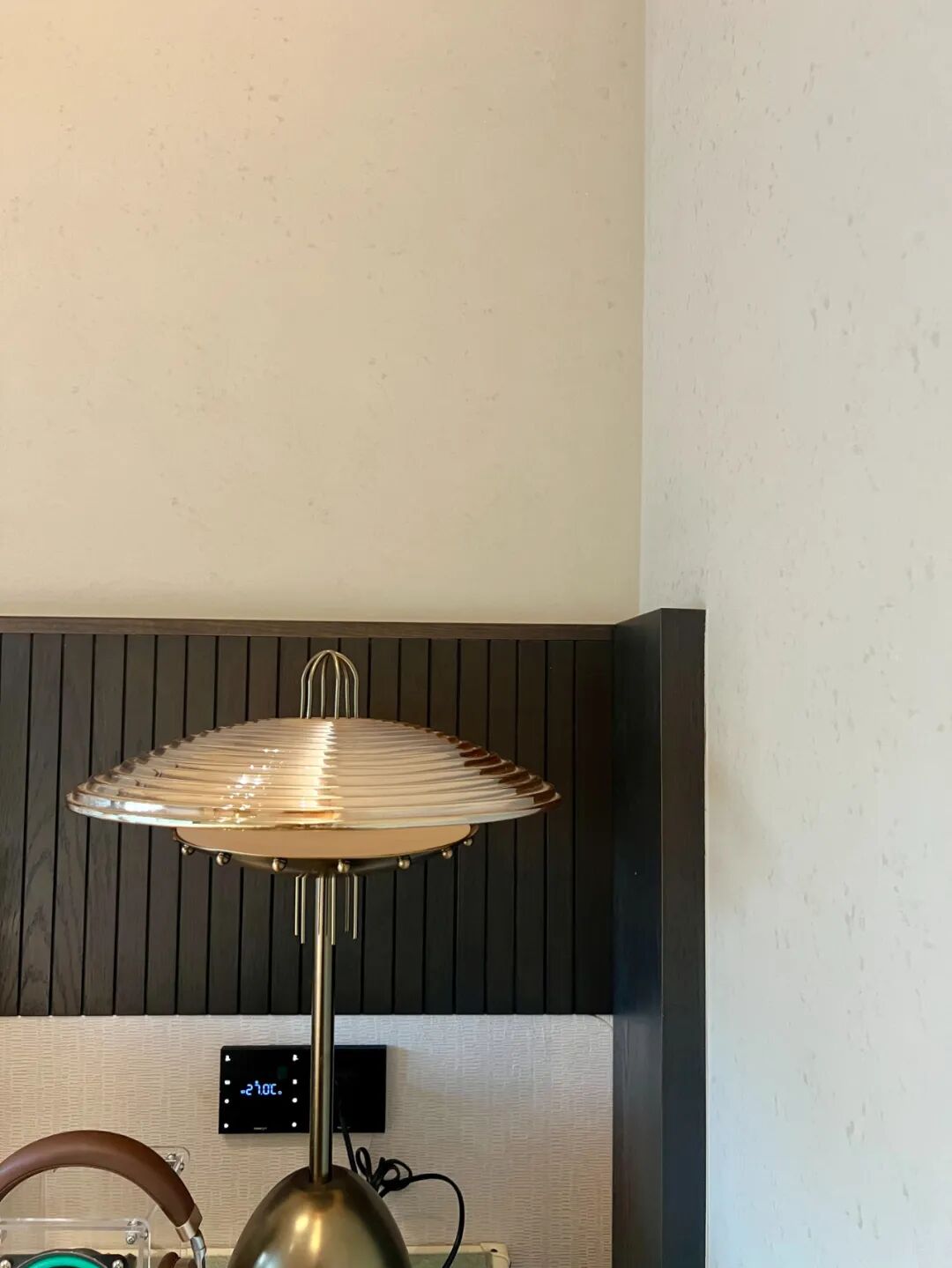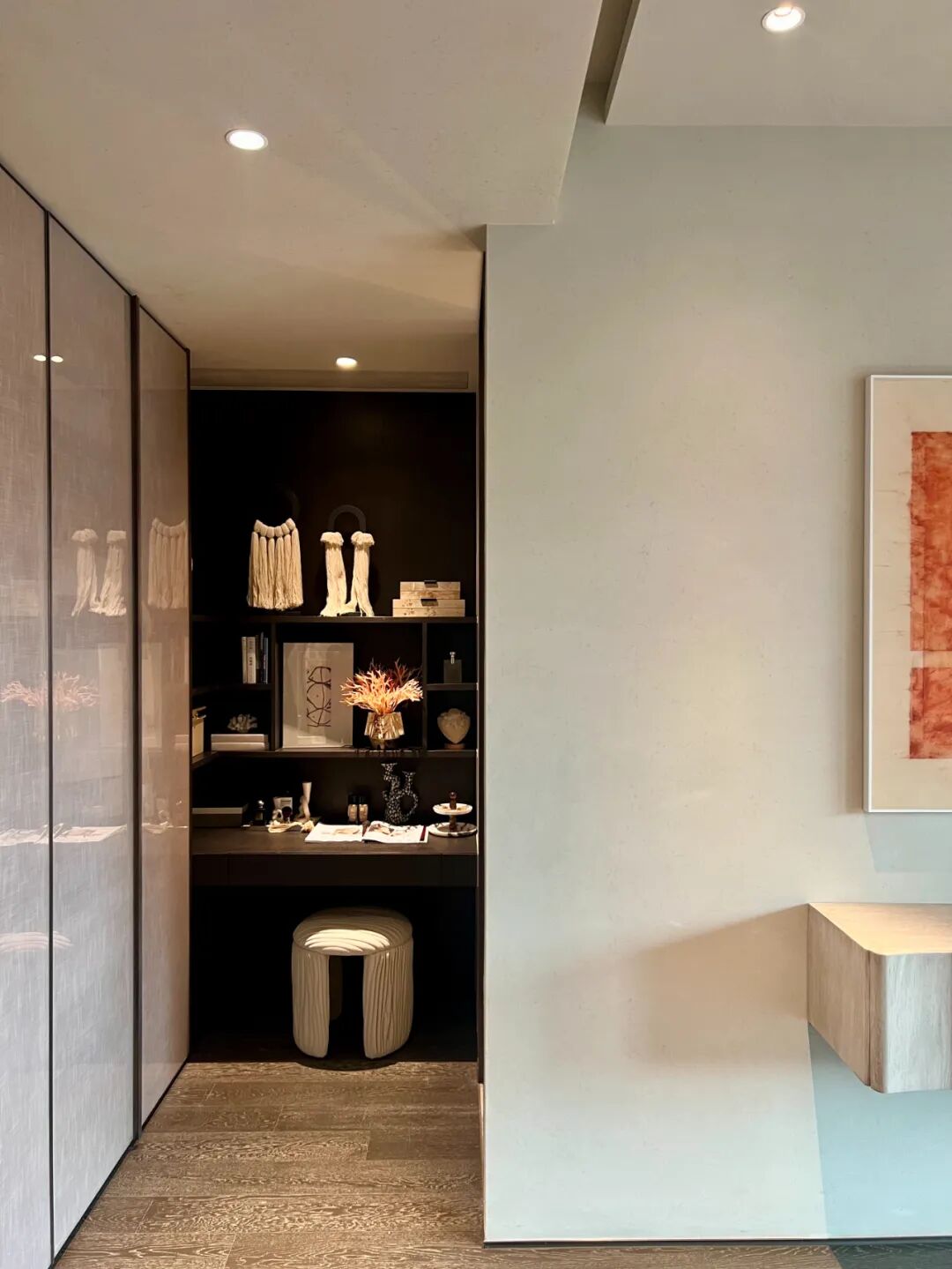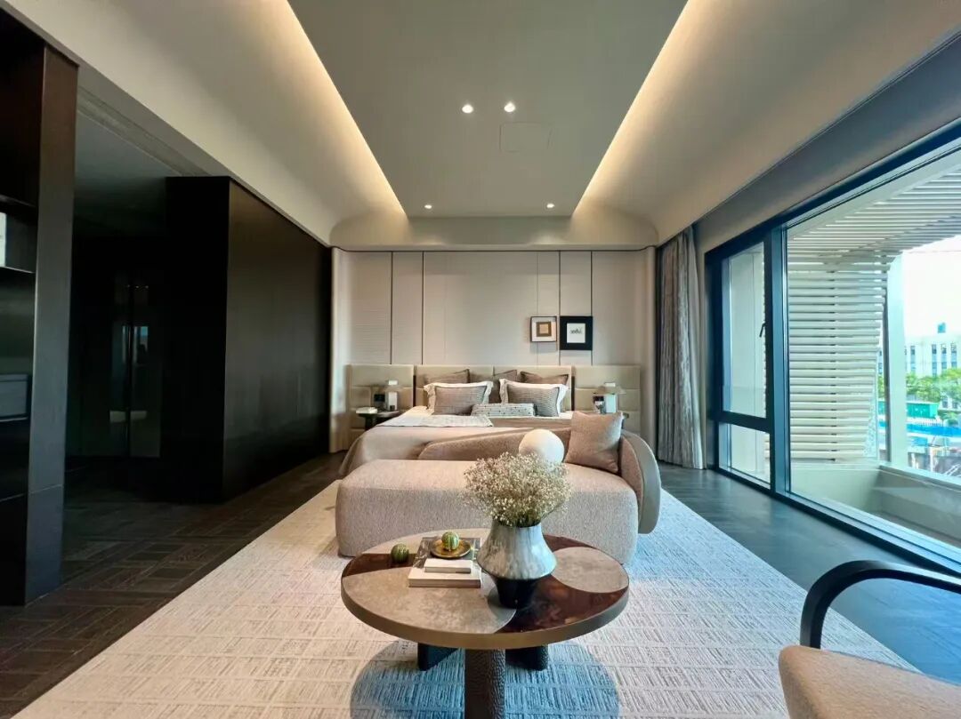 “我们选择深黑咖木饰面,是因为它的沉稳能够平衡浅米灰色的轻盈,同时木质本身的天然纹理又能与艺术漆的砂感形成呼应,”负责该样板房的设计师解释说,“这种搭配既现代又永恒,不会随着潮流逝去而显得过时。”